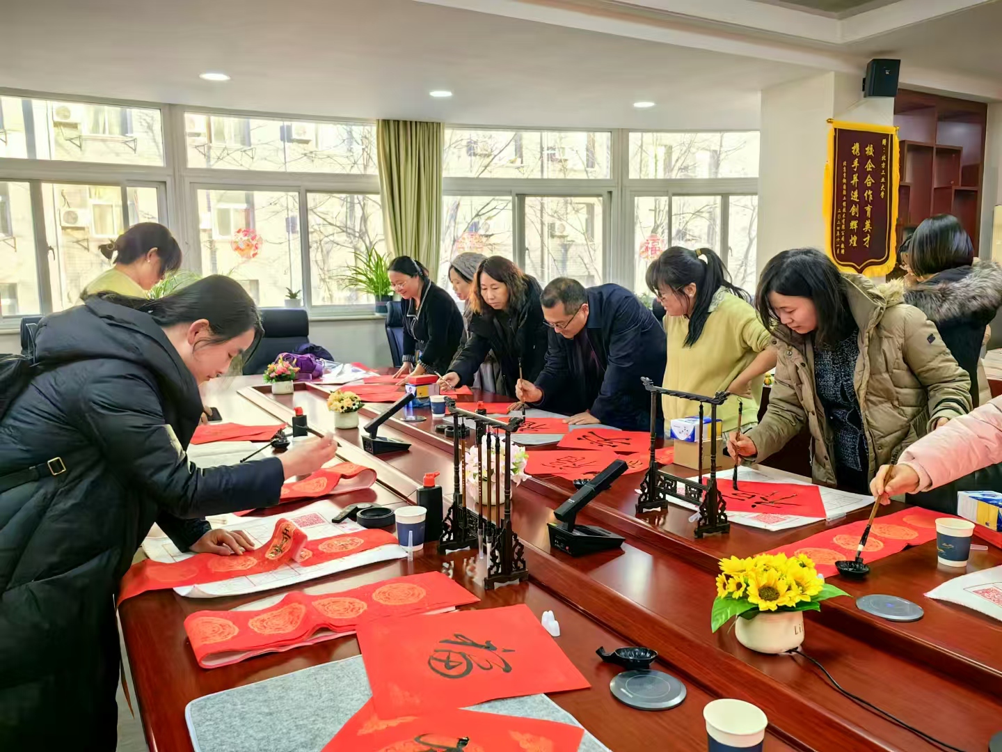 团拜会结合中国传统文化,分“茶香咖韵”“谜海迎春”“翰墨飘香”三个板块进行,设置了多元化、多元素的迎新春活动。活动现场热闹非凡,教师们品香茗、猜灯谜、写春联,散发着浓浓的年味儿。