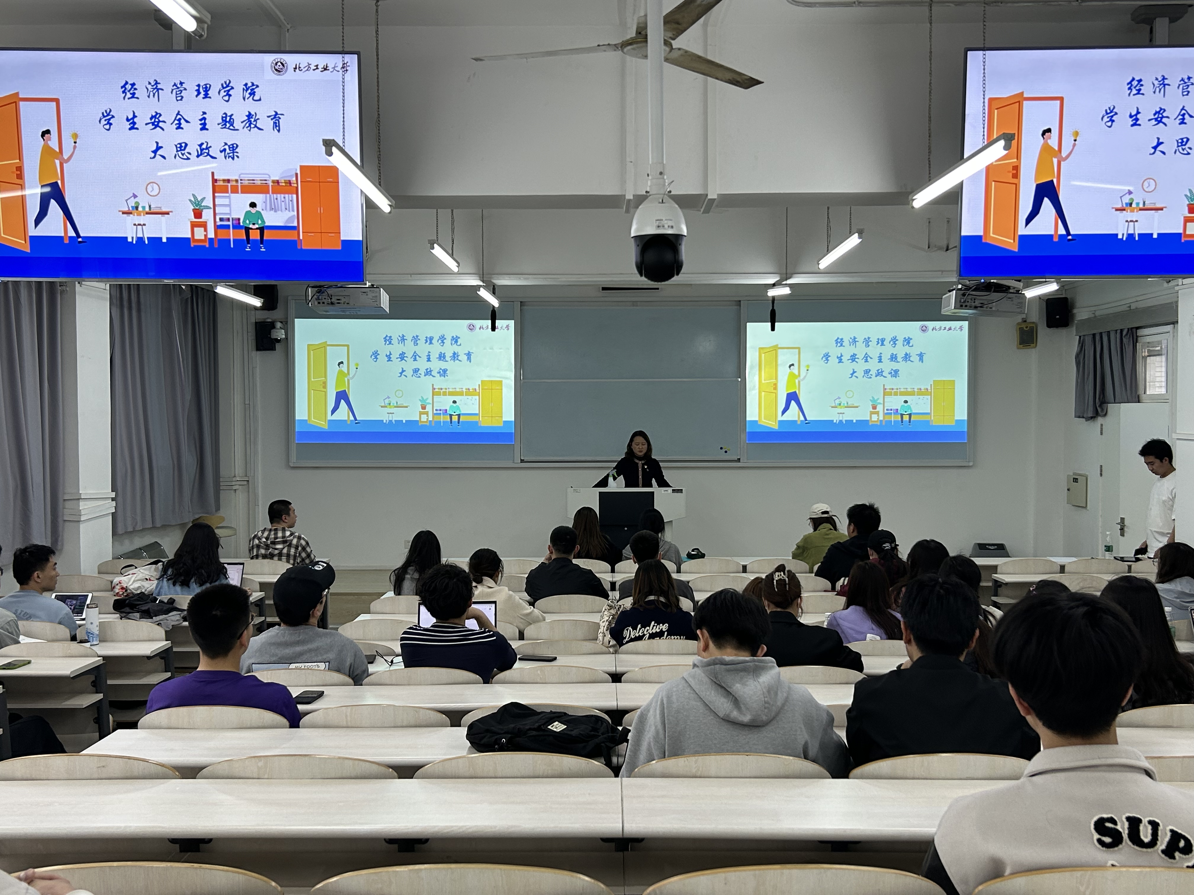 王帏老师围绕消防安全教育、五一假期安全教育、财产安全教育、违禁物品预防教育、健康教育这五个方面内容,深入细致进行了安全主题教育“大思政课”。王帏老师指出,安全稳定重于泰山,学校一直把学生安全教育摆在学生工作中最重要的位置。希望同学们要切实做到宿舍消防安全,坚决不在宿舍内吸烟、不在宿舍使用违规电器、不在宿舍存放易燃易爆等违禁物品、不能私自改拉电线。五一假期将至,希望同学们要注意假期出行安全和财产安全,做自己健康的第一责任人,度过一个平安、愉快的假期。