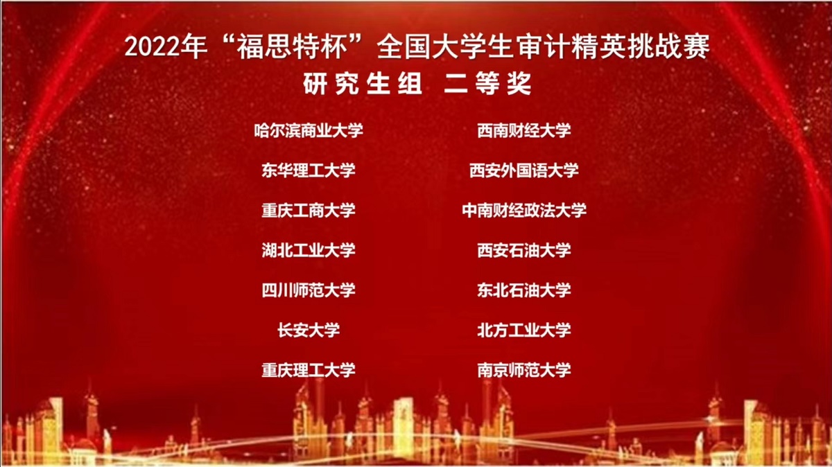 “福思特杯”全国大学生审计精英挑战赛是目前财会审计类专业具有较大影响力的全国性赛事之一。本次大赛由中国审计学会审计教育分会主办、南京审计大学政府审计学院承办。大赛的目的是积极探索审计专业发展的新视域、新路径和新方法,创新实现大数据、区块链等信息技术与审计专业教育的深度融合,培养适应社会经济发展需要的高素质、专业化审计人才。大赛至今已成功举办四届,累计吸引了来自全国29个省市的200多所高校,近5000名师生参与。买球体育会计系是第二次派出研究生队伍参加此项比赛,并首次取得二等奖的佳绩。