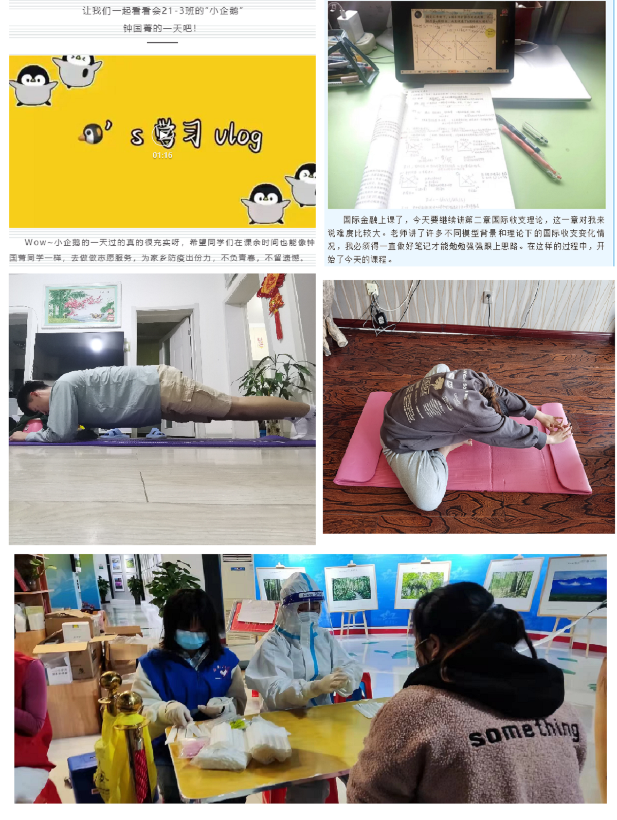 活动一经推出,学生参与热情高涨。同学们通过vlog、图片和文字等形式分享居家学习生活。大家的打卡内容广泛,除了分享上课日常外,还包含考研日常、读书笔记、英语积累、学术科研等内容。通过学习展示,为同学们提供了互相督促、互相激励的交流平台,切实提高了同学们的学习积极性。在“卡路里杯”运动打卡活动中,同学们参与居家运动项目,既有舒展身心的瑜伽,也有充满挑战的“一分钟”项目,提高免疫力,保持身心健康,为抗疫助力。