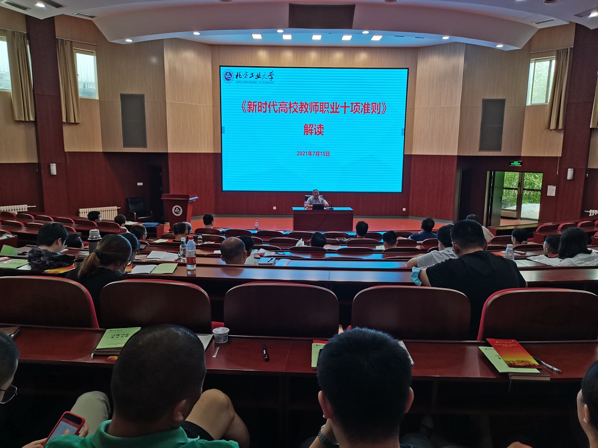 学院党委书记王伟宾以深入贯彻落实习近平总书记“七一”重要讲话精神和传达落实北京市教育系统“以案四说”警示教育大会精神为主线,认真反思检视问题的根源,做到明警示、知敬畏、守底线、严规矩、强制度、促发展,号召全院教师将思想和行动统一到学校党委的统一部署中来,坚决扛起从严治党主体责任。在师德专题警示教育会中,他带领大家分析了新时代师德建设的意义要求,认真梳理了教育部、北京市和学校的有关文件,并结合近几年学校师德失范的典型案例逐一剖析,引导广大教师争做“四有好老师”,当好“四个引路人”,坚守“四个相统一”,真正扛起新时代教育工作者的根本使命与责任担当。