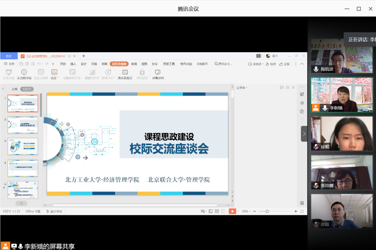 6月10日下午,为进一步推进课程思政建设工作,买球体育官方网站与北京联合大学管理学院开展了课程思政建设线上交流座谈。在学院党政联席会安排部署下,陶晓波、郝凯、罗文豪三位教师作为代表,参加了此次线上交流座谈。