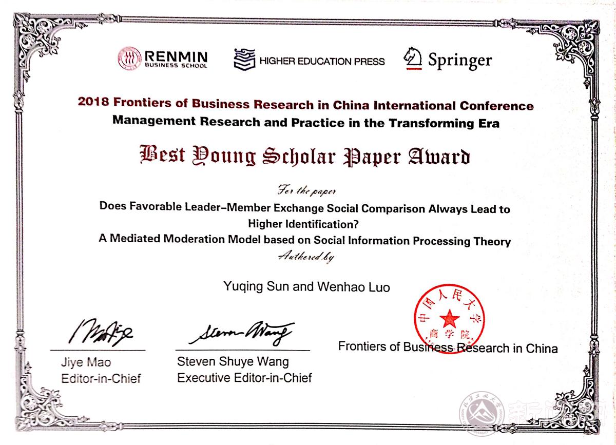在本次会议中,买球体育经管院工商管理系罗文豪博士在“领导力”分论坛上报告了他与合作者的研究成果,并喜获FBR国际会议“最佳青年学者论文奖”(Best Young Scholar Paper Award)。