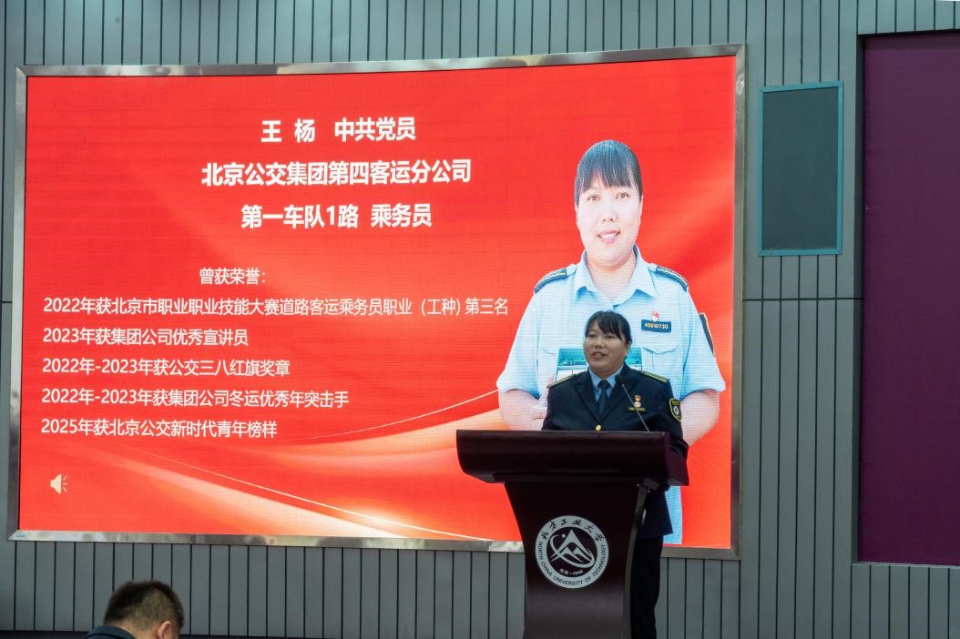 王杨,第一车队1队乘务员,2025年北京公交新时代青年榜样,带来《同行十年 一路成长》的分享。她从初入公交行业时的懵懂,到扎根1路后的坚定,面对困难从不言弃,始终秉持“钻”劲钻研服务。在1路这片沃土上,她不断成长、实现自我突破,找到人生价值的舞台。