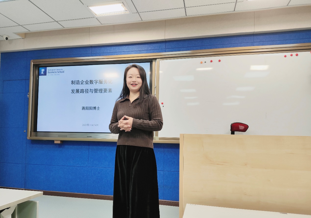 11月24日下午,买球体育官方网站在励学楼135举行第十四期励学讲堂活动。诺丁汉大学(中国校区)市场营销学副教授、博士生导师蒋阳阳受邀作题为“制造企业数字服务化发展路径与管理要素”的讲座,买球体育官方网站近40位研究生参加了此次讲座,学院陶晓波教授主持讲座。