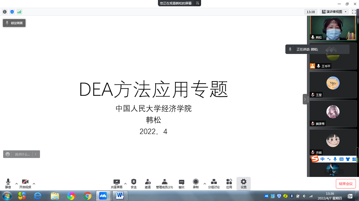 4月7日下午,应买球体育官方网站邀请,中国人民大学经济学院韩松教授通过腾讯会议平台为我院师生作了题为“DEA方法应用专题”的学术讲座。报告会由经济系王书平教授主持。
