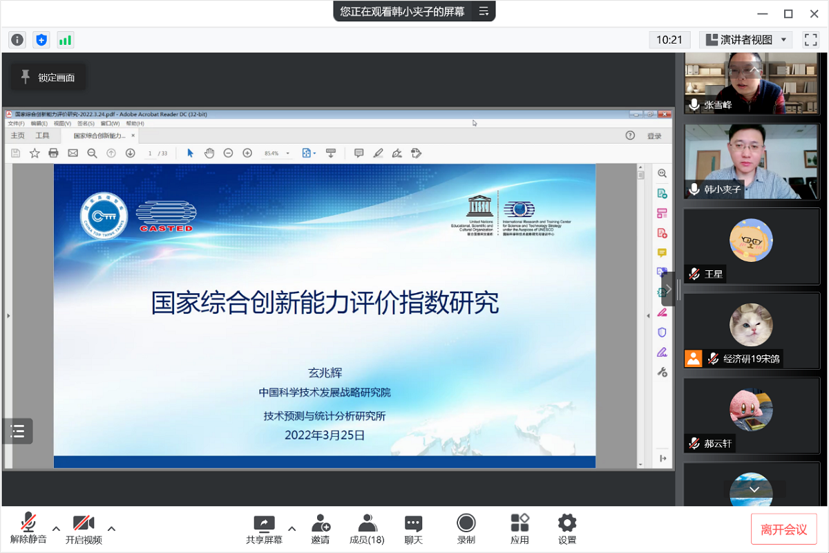 3月25日下午,应买球体育官方网站邀请,中国科学技术发展战略研究院技术预测与统计分析研究所所长,玄兆辉研究员通过腾讯会议APP为买球体育师生作了题为“国家综合创新能力评价指数研究”的线上学术报告。报告会由经济系张雪峰副教授主持,经济系经济研究生参会。