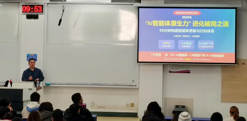 本次课程深入探讨了AI智能体在管理实践中的应用与商业变革。单龙总经理从管理学专业视角出发,阐述了人机多智能体协同交互模式,重点讲解了职业发展规划智能体的构建与应用,将抽象概念转化为可操作的实施框架,并演示了如何借助智能体技术解决职业困惑、提升核心能力等内容,为同学们的学业发展与未来就业提供全新思路。