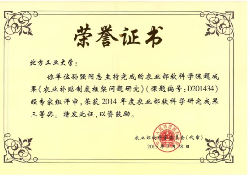 孙强老师荣获2014年度农业部软科学研究成果三等奖 |