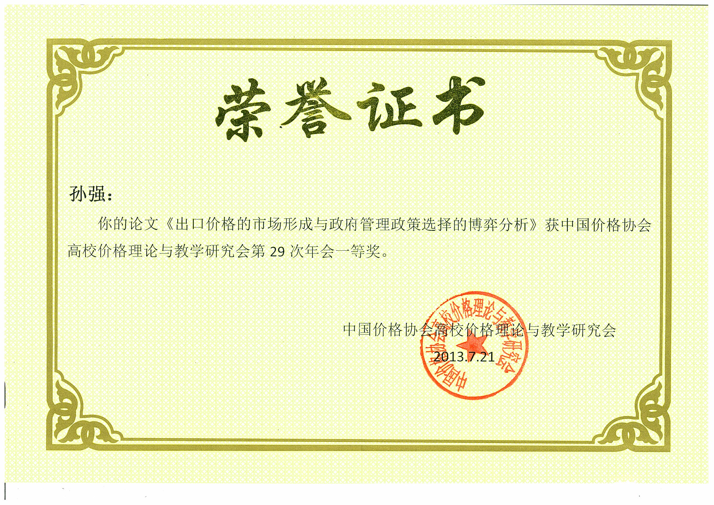 孙强老师荣获中国价格协会高校价格理论与教学研究会 第29次年会一等奖 |