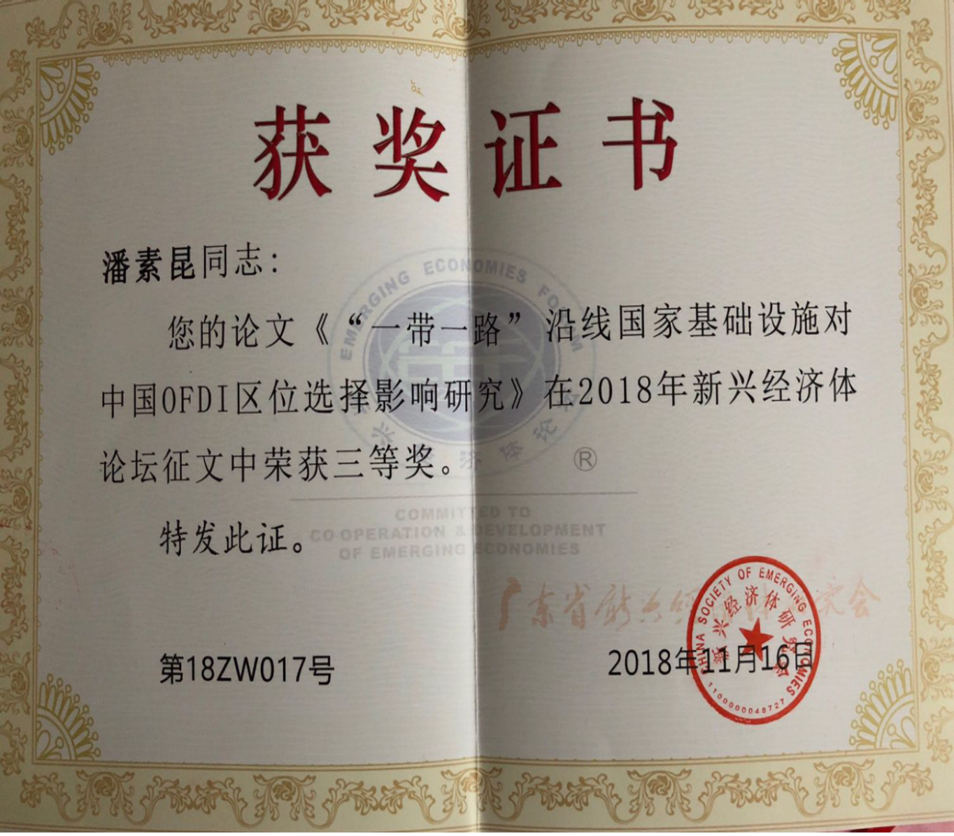 潘素昆老师在2018年新兴经济体论坛征文中荣获三等奖 |