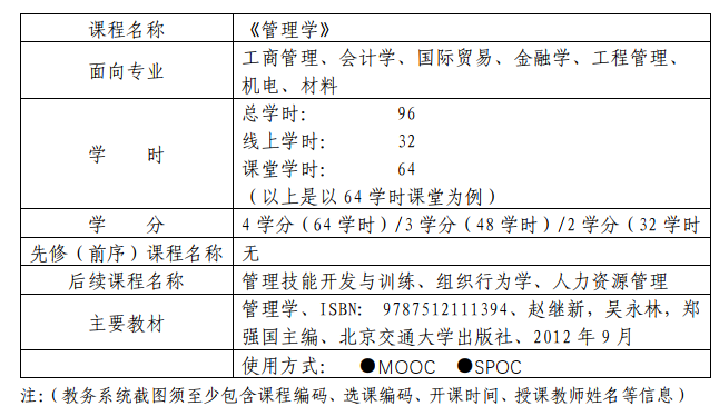课程与教学改革要解决的重点问题:作为买球体育官方网站首批上线中国大学慕课网的课程,要解决的重要问题有:(1)线上课程如何进行设计、制作、发布和分享?我们坚持开放共享的建、用、学、管方式,为学习型社会、学习型政党、学习型国家建设提供支撑。如何让我们制作的管理学在线课程让更多的校内学生和社会人士受益是我们面临的重要问题。(2)线下课程如何进行混合式教学的设计、实施和评价?混合式教学对于课程目标、教学内容、教学方法、教学模式、课程评价都提出了新的要求,如何把线上课程和线下课堂结合起来是面临的一个重要难题。(3)教师的教学能力如何向混合式教学转变?混合式教学其实对于传统的教学提出了更高的要求,教师必须首先进行转变,更好地促进提升学生的学习兴趣,让学生成为学习的主体。