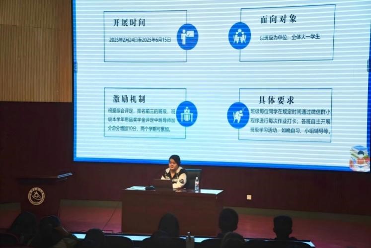 学院团委宋瑶同学介绍了本学期面向24级开展的 “笃学计划”“勤学计划”“助学联盟”等促学活动。依托《培养方案》开展课程辅导、四级学习、趣味英语展示、晨光半小时等活动,号召学生干部积极组织同学参与,发扬学生干部示范作用。