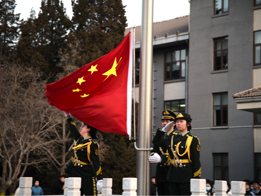 在全体师生的注视下,国旗班的队员们踏着整齐有力的步伐,喊着激昂嘹亮的口号,护送着鲜艳的五星红旗进场。伴随着《义勇军进行曲》,五星红旗冉冉升起,全体师生行注目礼,庄严肃穆。