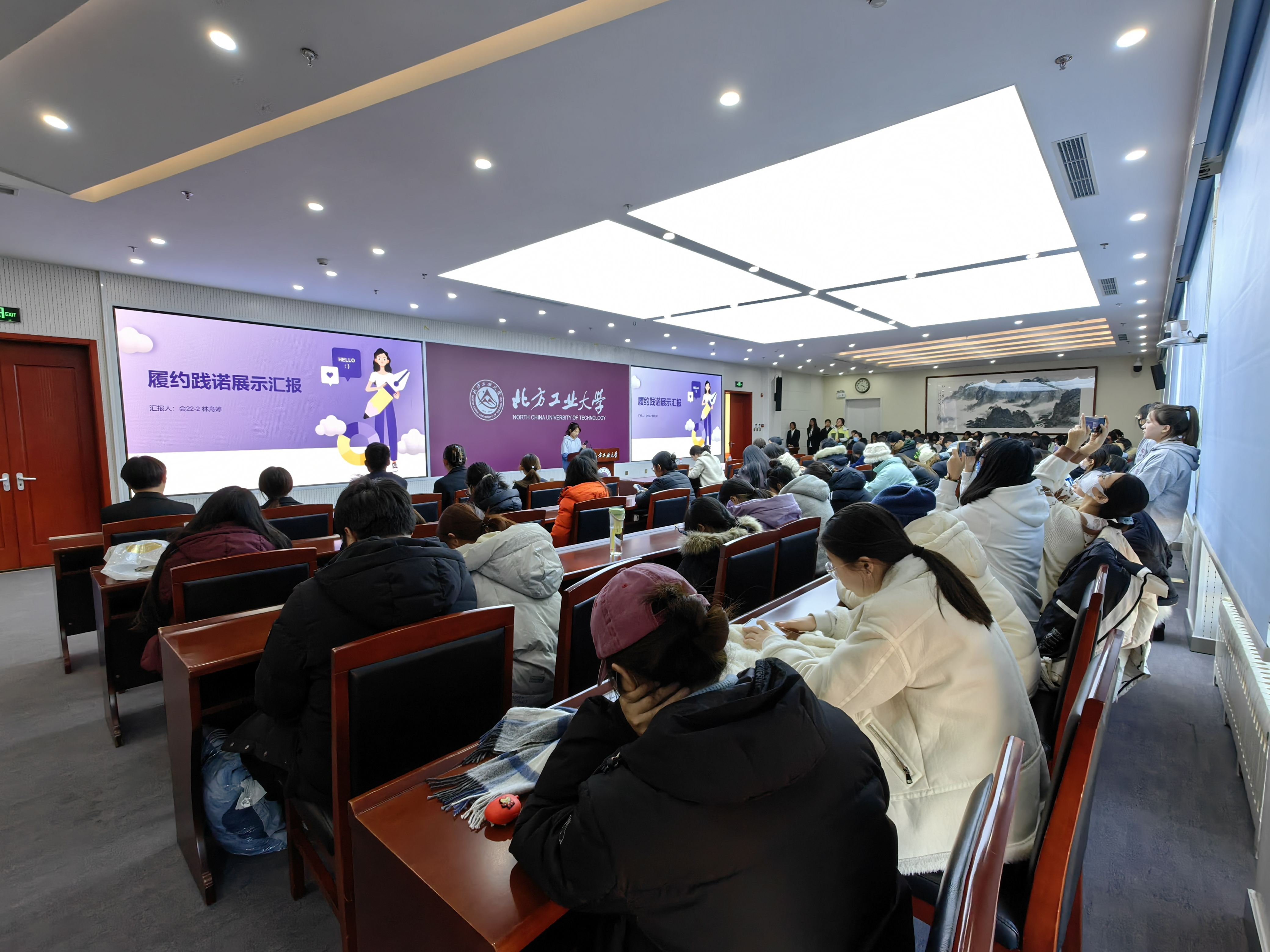 12月21日下午,买球体育官方网站在浩学楼报告厅组织秋季学期“履约践诺1+2+3”汇报展示会,学院党委副书记王帏、团委书记吴芳、党务秘书马丽听取了展示汇报。
