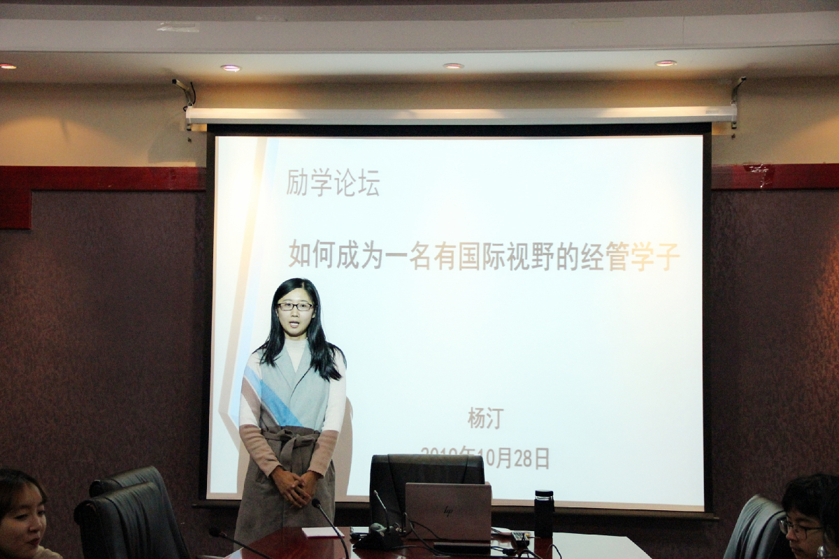 10月28日晚,买球体育官方网站励学论坛在励学楼201会议室举行。本期论坛主题为“如何成为一名有国际视野的经管学子”。本次论坛由教师辅导员杨汀老师主讲,青创部协办,19级国际班有出国深造意向的同学参加了此次论坛。
