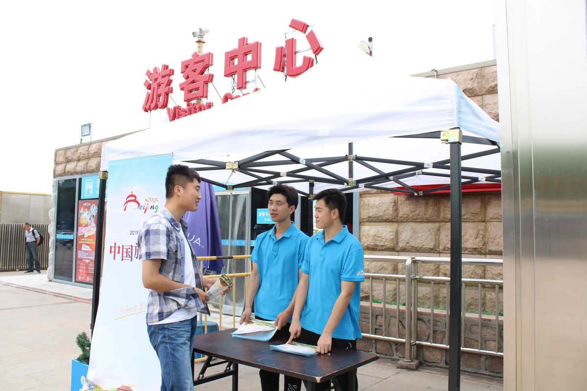 在“中国旅游日”志愿服务活动中,部分志愿者发放宣传手册,向游客认真介绍中国旅游日的发展情况。另一部分志愿者协助疏散游客,对游客进行引导。同学们热心细致的服务获得了工作人员和游客的一致好评。