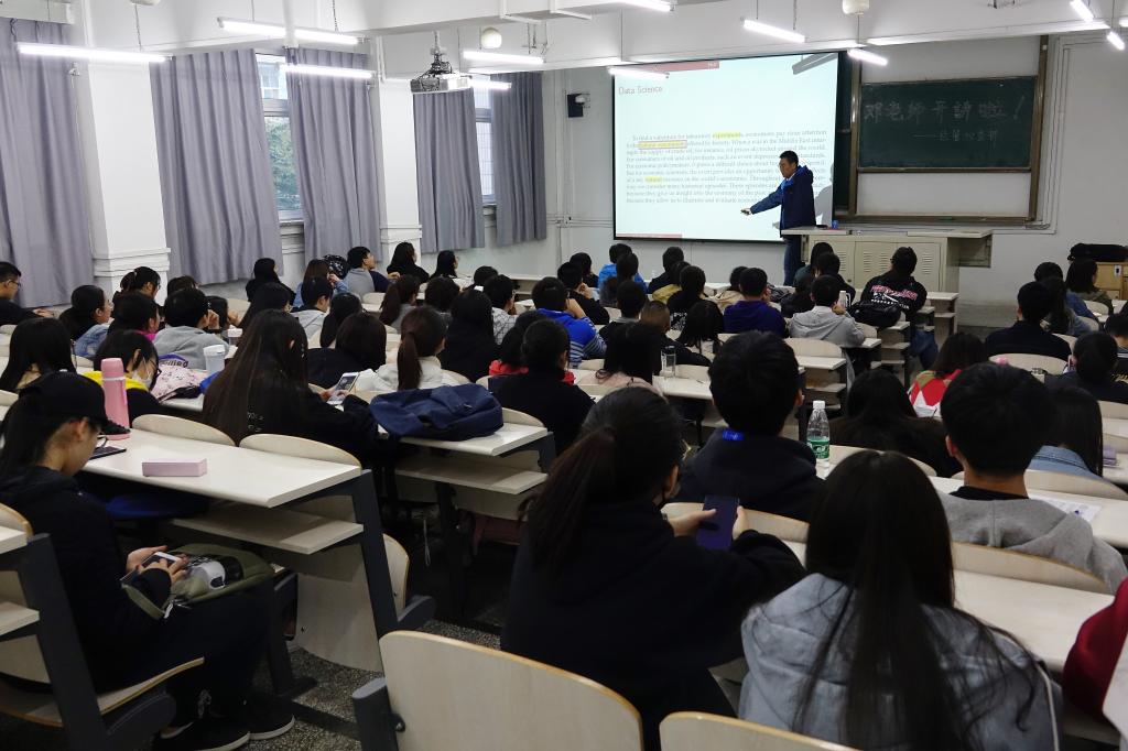 邓鑫老师用幽默风趣的语言拉开序幕。首先,邓老师向大家强调了提高学术能力的重要性,以及我们为什么要接受教育。其次,邓老师向大家介绍了大学生应该重视高数和英语的学习,除此之外还应该学习一些数据科学。对于学习诀窍的看法,邓老师明确表示:学习没有捷径,只能凭借自身努力。邓老师用自己在中央财经大学、四川师范大学和中山大学的学习经历作对比,向学生们直观地阐述了自律自学的重要性,并解答了一些同学对于考研的疑惑。