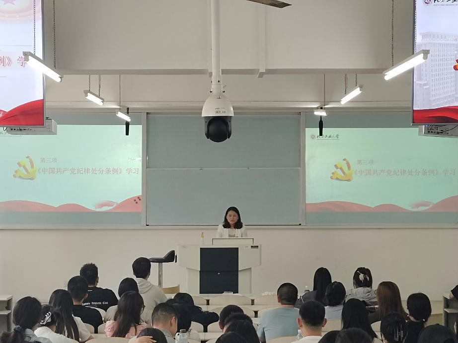 为深入学习贯彻习近平总书记关于党纪学习教育的重要讲话和重要指示精神,进一步加强毕业生党性教育,做好毕业生离校教育和思想政治工作,5月16日下午,买球体育官方网站在励学楼228教室开展2024届毕业生党员专题教育活动。学院党委书记谢朝阳给毕业生党员讲授了毕业党课,党委副书记王帏领学了《中国共产党纪律处分条例》,170余名毕业生党员参加活动。