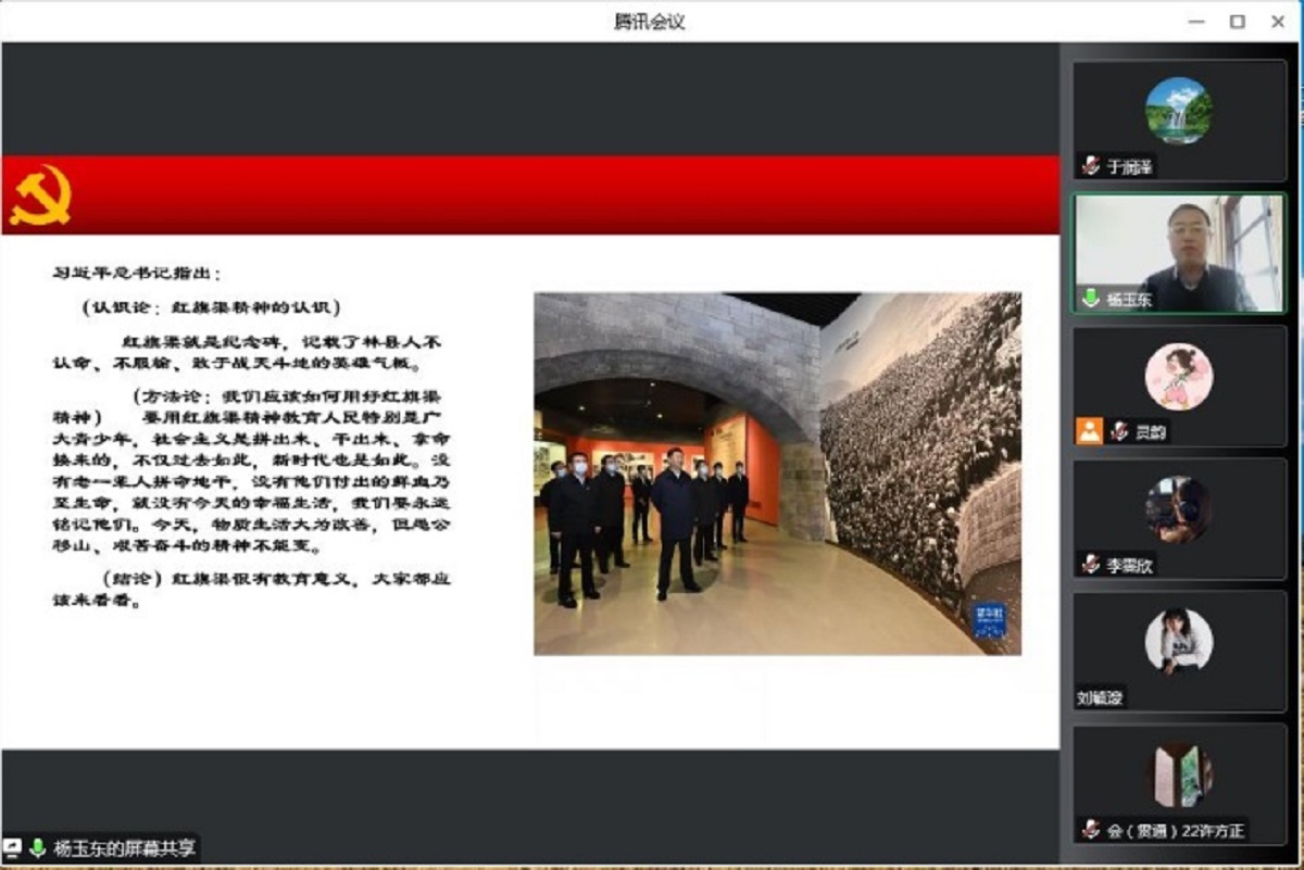 为深入学习贯彻习近平新时代中国特色社会主义思想和党的二十大精神,深入学习红旗渠精神,强化学院党员理论水平,12月1日,买球体育官方网站邀请河南省安阳市林州市委宣传部副部长杨玉东同志讲授红旗渠精神专题党课。学院全体师生党员通过腾讯会议线上进行党课学习,会议由学院党委副书记王帏主持。