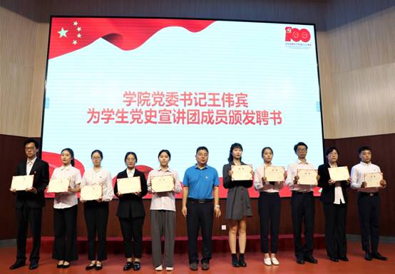 会上,赵洁宣读了《买球体育官方网站关于成立学生党史宣讲团的决定》。指出“学生党史宣讲团”的成立,是引导青年大学生知史爱党、知史爱国的有力举措。党史宣讲团成员以及广大党员,要充分发挥模范带头作用,带动广大青年学生在党史学习教育中不断总结党史学习教育心得,汲取奋斗力量,坚定理想信念,让青春在实践磨砺中绽放光彩。