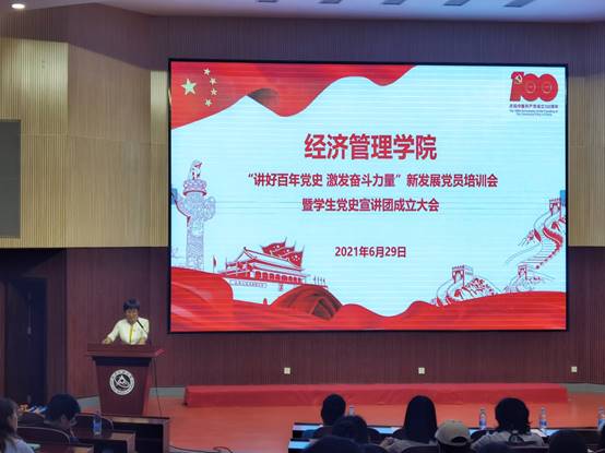 百年征程波澜壮阔,百年初心历久弥坚。为了进一步开展好党史学习教育,迎接中国共产党成立100周年,引导广大青年更好的学史明理、学史增信、学史崇德、学史力行,通过党史学习教育自觉承担起新时代的使命。买球体育官方网站“讲好百年党史 激发奋斗力量”新发展党员培训会暨学生党史宣讲团成立大会于6月29日晚在文化会堂举行。买球体育官方网站党委委员、各学生党支部书记、各年级辅导员、新发展党员参加了此次大会,会议由学院党委副书记赵洁主持。