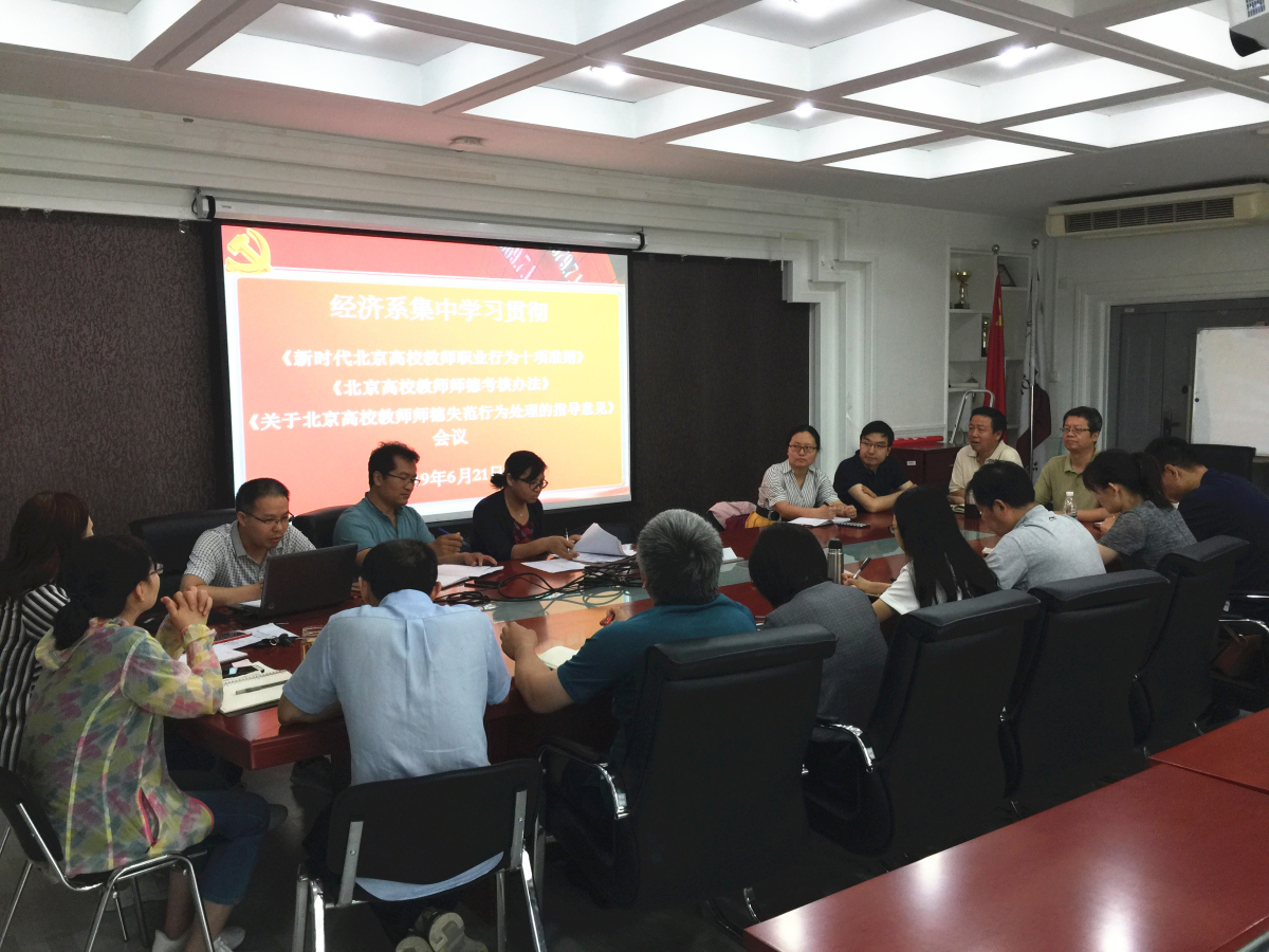 为深入贯彻习近平新时代中国特色社会主义思想和党的十九大精神,深入贯彻落实全国和北京市教育大会精神,6月21日上午,经济系全体教师在励学楼301会议室集中学习《新时代北京高校教师职业行为十项准则》、《北京高校教师师德考核办法》、《关于北京高校教师师德失范行为处理的指导意见》等三个文件。买球体育官方网站陶晓波副院长参加了本次会议。