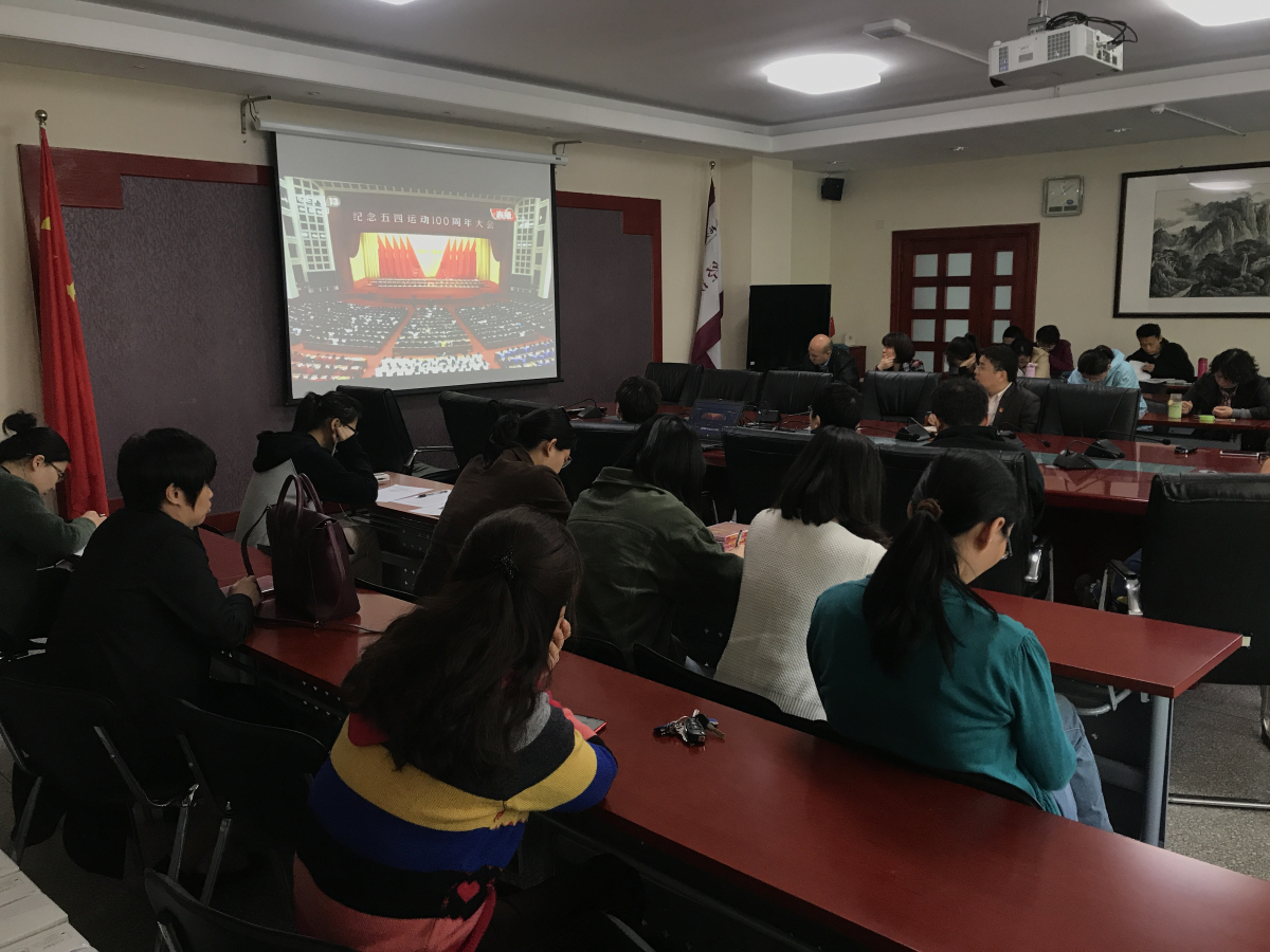 2019年4月30日上午10点30分,买球体育官方网站党委在励学楼201会议室组织学院教工党员及学生党员集中观看纪念五四运动100周年大会,一同学习习近平总书记的重要讲话。