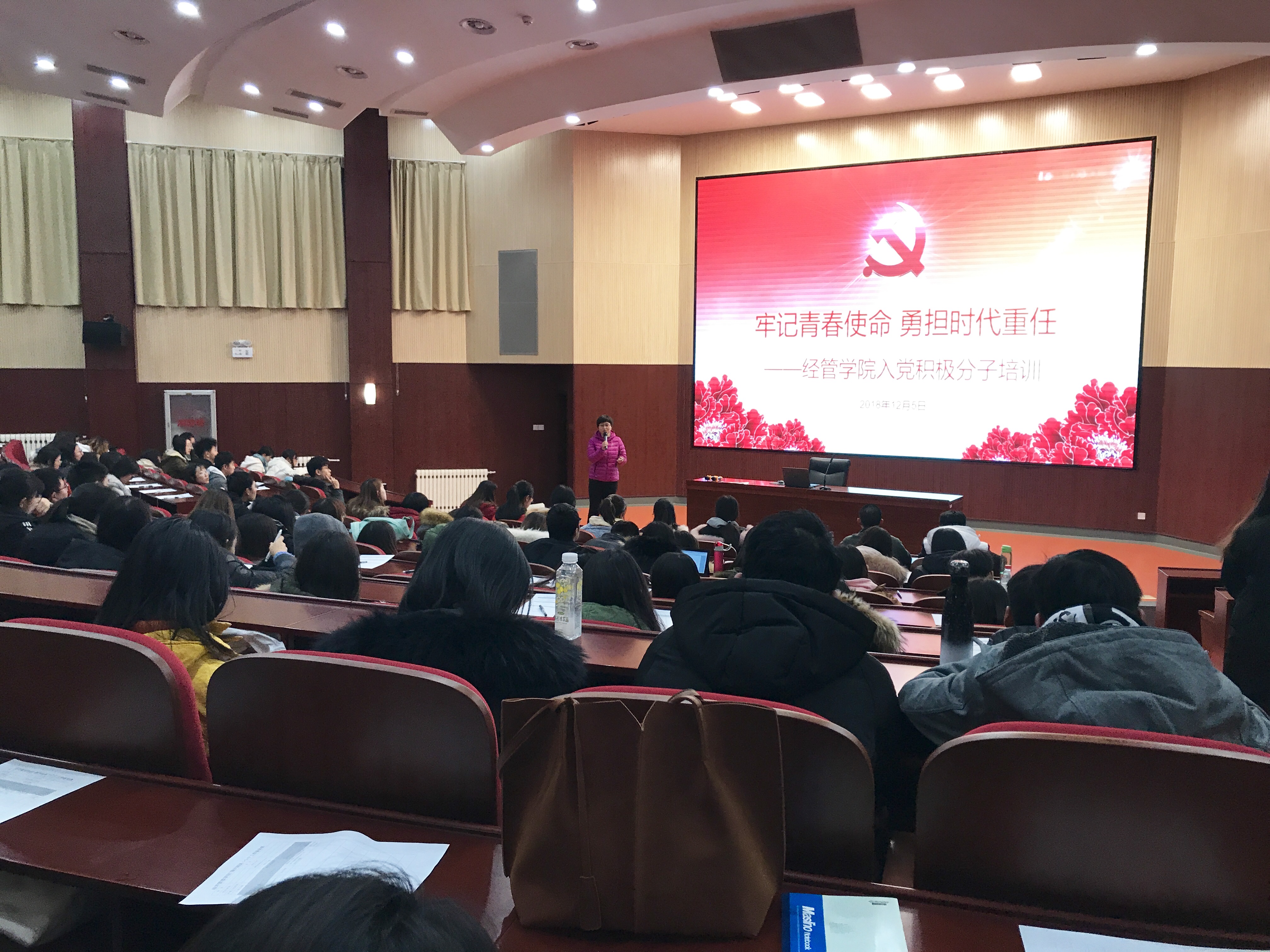 2018年12月5日下午,买球体育官方网站在文化会堂组织召开了本学期入党积极分子培训会暨经管团校第六课,本学期推选出的积极分子以及团学骨干近200名同学参加了此次培训,学院党委副书记赵洁老师担任此次培训会的主讲人。
